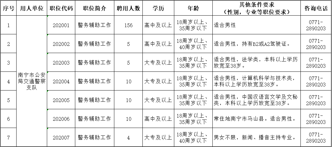 1、南宁市公安局2020年度公开招聘警务辅助人员职位计划表(交警支队岗位)
