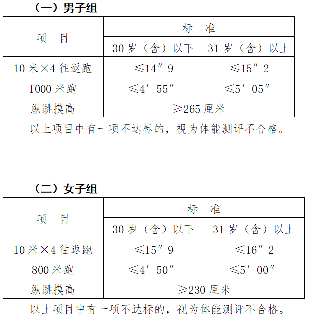 男子测试项目:1000米跑、10米×4往返跑、纵跳摸高;