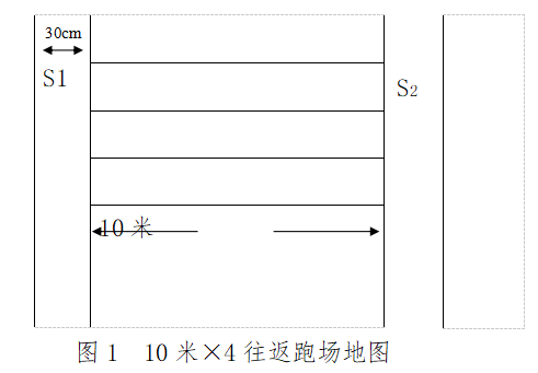 测验方法:受测者用站立式起跑,听到发令后从S1线外起跑,当跑到S2线前面,将30厘米区域中立着的木块(瓶子)推倒随即往回跑,记录跑完全程的时间。记录以秒为单位,取一位小数,第二位小数非“0”时则进1。