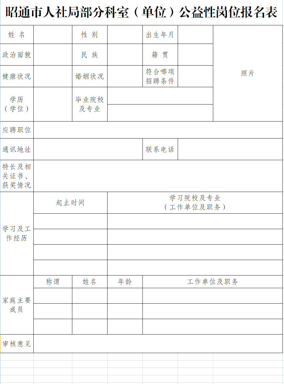 云南昭通市人力资源和社会保障局招聘公告 2020-07-28 11:57 系统导入 招考信息 昭通 文章摘要 为贯彻落实《中华人民共和国就业促进法》、《就业服务和就业管理规定》,帮助有劳动能力和就业愿望的就业困难人员实现就业,市人社局部分科室(单位)拟向社会公开招聘公益岗位人员7名,现将有关事项公告如下:一、 ... 为贯彻落实《中华人民共和国就业促进法》、《就业服务和就业管理规定》,帮助有劳动能力和就业愿望的就业困难人员实现就业,市人社局部分科室(单位)拟向社会公开招聘公益岗位人员7名,现将有关事项公告如下:一、招聘条件满足下列条件之一,有就业能力和就业愿望的办理城镇登记失业的人员:1.零就业家庭人员;2.享受城乡居民最低生活保障人员;3.男年满50周岁和女年满40周岁以上的大龄失业人员;4.有劳动能力的残疾人;5.连续失业一年以上人员;6.连续失业6个月以上的应届离校未就业高校毕业生;7.连续失业3个月以上的易地扶贫搬迁至城镇的建档立卡贫困劳动力。二、岗位要求1.具备国家承认的大专以上学历。2.拥护中国共产党的领导,拥护党的理论和路线方针政策,具有良好的政治素质、专业能力和职业操守。3.遵守国家法律法规,品行端正,自愿从事公益性岗位工作,服从组织分配、保守工作秘密,具有忠诚、奉献、吃苦耐劳的精神。4.具备与招聘岗位相匹配的其它条件。三、招聘岗位及要求(一)市人社局劳动关系科1人。 1.岗位要求:全日制、自学考试专科及以上学历,男女不限,能够熟练操作WPS办公软件。 2.工作职责:协助处理科室日常业务工作。 (二)市人社局工伤保险科1人。 1.岗位要求:全日制、自学考试专科及以上学历,医学类专业,男女不限。 2.工作职责:配合开展劳动能力鉴定相关工作。(三)市职业介绍中心5人。1.岗位要求:全日制、自学考试专科及以上学历,男女不限,在校期间担任过学校团委、学生会、社团主要职务,或毕业后有会计、办公室文秘工作经验者优先。2.工作职责:协助收集、汇总就业创业工作报表;配合开展部分就业创业和综合业务工作。二、福利待遇采取试用期制,试用期为一个月。试用期满后购买养老、工伤、医疗、失业保险。工作时间和休息休假按有关规定执行,在缴纳工会费后可同等享受工会会员福利。工作满6个月(含试用期)进行绩效考核,评定为合格以上等次的按半年一次性发放绩效奖励。三、用工期限公益性岗位聘用期最长不超过三年。四、招聘程序(一)发布公告。通过网络渠道公开发布招聘公告,详见:昭通市人民政府官网:http://www.zt.gov.cn/、昭通市公共就业服务网:http://www.ztggjy.cn/和“昭通人社”微信公众号。(二)报名。求职人员通过邮箱投递报名资料。(三)资格审核。招聘单位对求职人员资格进行审核。(四)组织面试。招聘单位根据资格审核后的人员情况,对符合条件的应聘人员组织面试,面试时间地点另行通知。(五)公示。对拟聘用人员进行公示,公示期为5个工作日。(六)聘用。公示无异议后,双方签订昭通市公益性岗位聘用协议。五、报名(一)报名时间2020年7月27日至8月10日。(二)报名方式因疫情期间,为减少人员聚集,采用网络报名方式进行。请应聘者将身份证、《毕业证书》、2寸彩色证件照、《就业创业证》或《就业失业登记证》第2、3页和第6、7页,其他个人材料:如:荣誉证书、职业能力证书等(以上证件拍照或扫描均可)以及公益性岗位报名表统一报送至ztsjyjjyk@163.com。联系人:董鹏飞;联系电话:0870—2139718。附件:昭通市人社局部分科室(单位)公益性岗位报名表昭通市人力资源和社会保障局2020年7月27日 附件下载提示 如遇到附件无法下载,可添加小编微信索取: 上岸小编微信: shangan9168 、 招考小编微信: kaobian8168