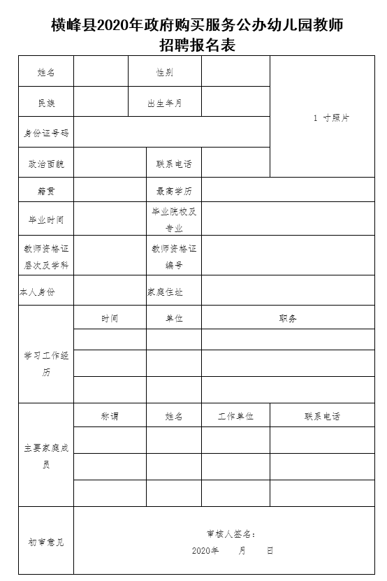 报考人员请提前如实填写《横峰县2020年政府购买服务公办幼儿园教师招聘报名表》一式两份,并提供本人近期(六个月以内)免冠两寸照片3张。