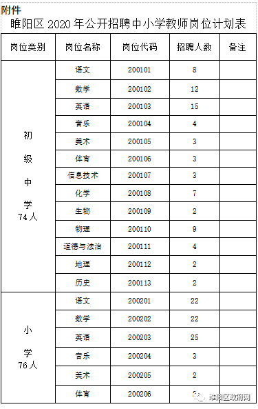 坚持德才兼备的用人标准及公开、平等、竞争、择优的原则。1.初中教师:符合招聘条件和岗位要求的普通高等院校全日制本科及以上学历的应、往届毕业生。2.小学教师:符合招聘条件和岗位要求的全日制师范类专业专科及以上、非师范类本科及以上学历的应、往届毕业生。面向社会公开招聘中小学教师150人,其中:中学教师74人,小学教师76人。(附:睢阳区2020年公开招聘中小学教师岗位计划表)。1.刑事处罚期限未满或者涉嫌违法犯罪正在接受调查的人员;2.尚未解除党纪、政纪处分或正在接受纪律审查的人员;3.近五年曾在公务员招录、事业单位公开招聘考试中被认定有舞弊等严重违反招聘纪律行为的人员;1.教师资格证任教学科与报考岗位一致,符合招聘岗位所需要的资格条件。2.往届毕业生须提供教师资格证;应届毕业生可暂不提供教师资格证,但录用后必须在1年的试用期内取得符合报考岗位要求的教师资格证,否则解除聘用合同。3.年龄要求在35 周岁(即1985年 07月31日以后出生)以下,硕士研究生及以上学历要求在40周岁(即 1980 年 07月 31 日以后出生)以下。4.新招聘人员必须服从招聘领导小组的工作安排,全部充实到乡镇学校,在乡镇学校工作不得低于3年。(一)发布公告:2020年8月6日--2020年8月14日在睢阳区人民政府网站发布公告。 1.时间:2020年8月15日--8月19日上午8:00-- 12:00、下午15:00--18:00。3.地点:睢阳区招生办公室(侯恂路与万达路交叉口往北200米路东商丘市睢阳区教育体育局院内南楼二楼)。本人毕业证、教师资格证、就业报到证、有效身份证(正反面)、学信网学历验证报告原件及复印件各一份。应届毕业生未取得与报考岗位相应级别教师资格证的考生还需提交普通话等级证。在职人员报考另需提交单位人事和主管部门同意报考的证明(事业单位服务期未满的人员不得报考)。1.本次招聘资格审查贯穿招聘工作全过程,报考人员应坚持诚信原则,如实提供相关材料,否则取消聘用资格。2.通过资格审查的人数与招聘岗位的比例不低于3:1,达不到规定比例的,相应核减该岗位招聘人数,直至取消该岗位招聘。报考岗位被取消的报考人员可在报名结束后一日内重新选报其他岗位。(三)考试:分为笔试和面试,采用统一命题、统一组织、统一评分的方式进行。1.笔试:采取闭卷方式进行,笔试成绩满分100分。笔试时间:2020年8月26日上午9:00-11:00。笔试内容:主要包括教师职业道德与个人修养、教育法律法规、教育学、心理学、时事政治及担任教师应具备的相关知识等。根据笔试成绩从高分到低分的顺序确定面试人选,参加面试人选与招聘岗位比例为3:1,比例内末位成绩相同者,均进入面试。达不到规定比例的,经睢阳区公开招聘中小学教师工作领导组同意,在确保竞争的前提下可适当降低比例。面试形式:以现场讲微型课的方式进行(报考体、音、美专业的人员还需要进行5分钟的才艺展示),由评委现场评分,总分为100分。3.考试总成绩:笔试成绩×50%+面试成绩×50%,总成绩保留到小数点后两位。本次招聘不组织、不委托任何培训机构和辅导班,不印制任何辅导资料。1.体检标准参照《河南省教师资格申请人员体格检查标准(2017年修订)》(豫教资办〔2017〕4号)规定执行,费用自理。体检不合格的不予聘用。2.睢阳区公开招聘中小学教师工作领导小组根据考试、体检结果等额确定考察人选,并组织考察。因考察不合格出现招聘岗位缺额的不再递补。根据总成绩和考察情况,择优确定拟聘用人员并在睢阳区人民政府网站进行公示。公示期7个工作日。公示无异议后,聘用人员按规定实行试用期制度,试用期为一年。试用期间工资福利待遇按有关规定执行。试用期满经考核合格后由事业单位人事部门办理相关手续。1.本次招聘工作由睢阳区公开招聘中小学教师工作领导小组统一组织实施,领导小组办公室设在睢阳区教育体育局。2.按照《河南省事业单位公开招聘工作规程》第五十五条规定,实行回避制度。3.按照常态化疫情防控需要,应试者应严格遵守国家疫情防控有关规定,考生要服从现场管理,按要求佩戴口罩,注意保持距离,做好防范工作。4.报考人员未按照招聘公告与招聘过程有关的通知要求执行的,一律视为自动放弃。5.报考人员务必保持电话畅通,因个人原因联系不上者视为自动放弃。被聘用人员要服从组织分配,对不服从分配者,取消聘用资格。6.对违反考试录用纪律的报考人员给予取消考试资格或录用资格处理。7.受聘人员未按规定时限上岗或未按要求办理相关人事手续的,视为自动放弃聘用资格。本方案由睢阳区2020年公开招聘中小学教师工作领导小组办公室负责解释,未尽事宜按照国家、省、市相关文件的规定执行。附件:睢阳区2020年公开招聘中小学教师岗位计划表睢阳区2020年公开招聘中小学教师