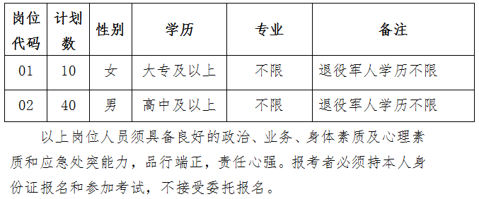 根据公安工作需要,面向社会公开招聘50名警务辅助人员。具体岗位及要求如表所示:
