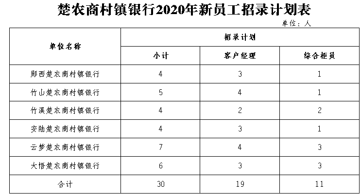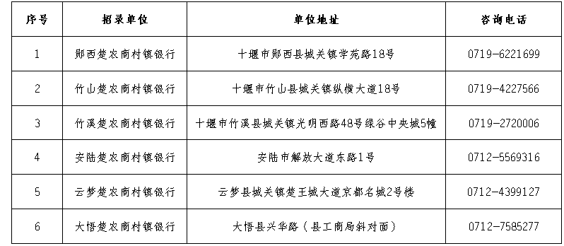 湖北随州农商行楚农商村镇银行招聘30人公告 2020-10-15 11:25 系统导入 招考信息 随州 文章摘要 湖北随州农村商业银行股份有限公司(以下简称“随州农商行”)于2015年分别在十堰、孝感地区共发起设立了9家楚农商村镇银行,是湖北省农商银行系统内发起设立村镇银行最多、规模最大的地方性金融机构。为满足楚农商 ... 湖北随州农村商业银行股份有限公司(以下简称“随州农商行”)于2015年分别在十堰、孝感地区共发起设立了9家楚农商村镇银行,是湖北省农商银行系统内发起设立村镇银行最多、规模最大的地方性金融机构。为满足楚农商村镇银行业务发展需要,现代表发起设立的楚农商村镇银行面向社会招录一批新员工。一、招录原则(一)公开报名、统一考试、平等竞争、择优录用;(二)定向报名、定向分配。二、招录岗位与名额(一)招录岗位:综合柜员、客户经理。(二)招录名额:30名。其中:客户经理岗19名,综合柜员岗11名。本次招录考试以各楚农商村镇银行为单位报名,各行招录计划见下表,其中郧县、丹江口、房县行本次无招录计划。三、招录条件(一)学历条件。大专及以上学历,含全日制及通过成人教育、函授、自考等方式并取得学历,专业不限;报考人员必须提供学历证书并通过网上学历认证方能报考。(二)年龄条件。1.大专和本科学历者,2020年应届毕业生不超过25周岁(1995年10月1日以后出生),往届毕业生不超过30周岁(1990年10月1日以后出生);2.硕士研究生及以上学历者,2020年应届毕业生不超过30周岁(1990年10月1日以后出生),往届毕业生不超过33周岁(1987年10月1日以后出生);3. 报考客户经理岗且具有银行主营业务岗位或保险公司客户经理营销工作经历1年及以上的人员,年龄不超过35周岁(1985年10月1日以后出生)。(三)户籍条件。需具有报考单位所在县(市)户籍或为该县(市)生源地考生(“生源地考生”仅限全日制应届毕业生,下同)。(四)其他条件。1.身体健康(笔试合格后经随州农商行统一组织体检合格)、遵纪守法、诚实守信(经征信查询无不良信用记录)、廉洁自律,无不良嗜好,无违规违纪违法不良记录。2.具有良好的综合素质,认同楚农商村镇银行企业文化和发展价值观,具备履行楚农商村镇银行员工岗位职责的能力。3.具有较强的学习能力、敬业精神和团队协作意识,能承受一定的工作压力,具有良好的书面和口头表达能力。四、招录程序及时间安排(一)报名及资格初审。各考生在随州农商行官网(网址:http://suizhou.hbxh.com.cn/)下载报名表格,在2020年10月14日9:00至 10月23日17:30将报名表发送至指定报名邮箱(czyhglb001@163.com),进行网上报名。考生报考时需认真选择报考单位和岗位,报考单位和岗位一经审核,不允许修改。各考生到所报考的楚农商村镇银行进行现场资格初审,资格初审时间为2020年10月26日至10月29日工作时间。考生在网上报名后到报考行进行资格初审须携带下列资料:①本人身份证、户口簿原件与复印件各一份;②毕业证原件与复印件一份;上述两项资料原件及复印件经审核一致后,原件退还报考人员,复印件报随州农商行复审。③教育部学信网网站查询的学历和学籍验证报告打印件一份(带二维码);④报名登记表(纸质版);⑤本人近期免冠2寸正面照片2张(红底、着白色上衣);⑥个人征信报告(凭本人身份证件在当地人民银行自助查询机打印)一份;⑦其他类型,具有银行主营业务岗或保险公司客户经理营销经历1年及以上的人员,除上述资料外,还需携带该段工作经历的证明材料原件(工作证明须注明工作单位、岗位和工作时间),证明材料需经该段工作经历所属单位人事主管部门盖章,方可认定有效。注意:网报后未在规定时间内进行现场资格审查的视同放弃报考。报考岗位人数不低于招录计划数3:1比例,低于该比例的,以各楚农商村镇银行为单位,由随州农商行进行调剂或减少招录计划。(二)资格复审。随州农商行将对通过资格初审的报考人员资料进行复审,确定最终通过资格审查人员名单。(三)面试。通过资格审查人员,由随州农商行统一组织安排面试,时间和地点视报考情况确定后另行通知。面试结束后,以报考的楚农商村镇银行为单位,分客户经理和综合柜员两类,分别根据面试成绩从高分到低分按招录计划1:2的比例确定参加笔试人员名单。(四)领取准考证。通过面试的考生,由各楚农商村镇银行通知领取准考证。(五)笔试。笔试由随州农商行统一组织,通过面试人员统一到随州参加笔试,具体考试地点和时间另行通知。笔试结束后,以报考行为单位,根据报考岗位的笔试成绩从高分到低分排名,按招录计划1:1的比例,确定参加体检人员。(若出现笔试成绩并列情况,等额增加招录名额)(六)体检。随州农商行统一组织预录人员体检,体检标准参照公务员录用标准执行。以报考行为单位,体检不合格的,根据笔试成绩排名进行递补。(七)预录公示。根据笔试成绩排名和体检情况确定预录人员名单,并在各楚农商村镇银行进行公示,公示时间为5个工作日,对公示期间收到举报并查实不符合招录条件的人员取消录用资格,产生的差额根据笔试成绩和体检情况进行递补。(八)岗前培训。公示结束后,随州农商行统一组织新员工入职培训。岗前培训启动后,放弃人员不再进行递补。培训考核不合格的,不予录用。培训时间和地点另行通知。(九)办理录用手续。岗前培训