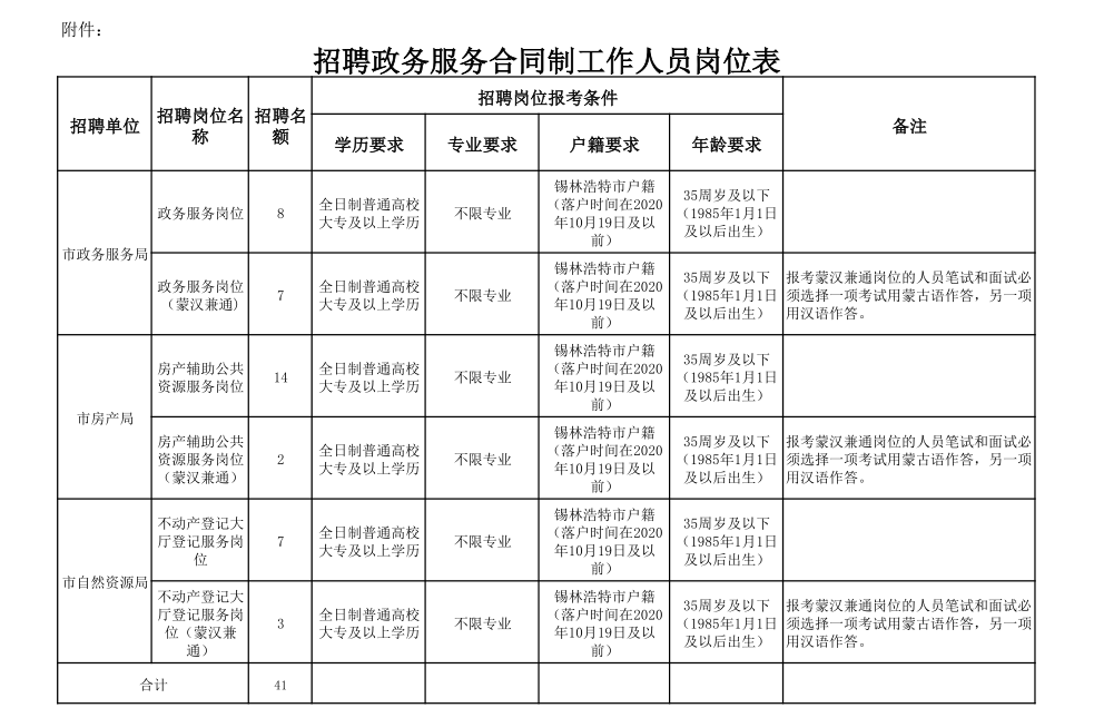 计划招聘政务服务合同制工作人员41名,其中政务服务大厅政务服务合同制工作人员15名(包括蒙汉兼通7名),房产局政务服务窗口合同制工作人员16名(包括蒙汉兼通2名),自然资源局不动产登记大厅登记服务岗位合同制工作人员10名(包括蒙汉兼通3名)。