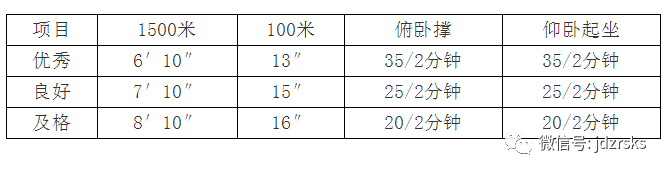 1、体能。体能测试满分100分,内容为1500米跑、100米跑、俯卧撑、仰卧起坐四个项目。1500米跑占体能成绩40%、100米跑占体能成绩20%、俯卧撑占体能成绩20%、仰卧起坐占体能成绩20%。