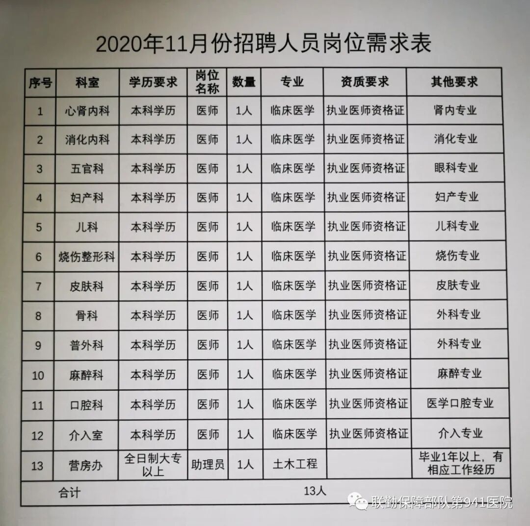 联勤保障部队第九四一医院(西宁)招聘公告 2020-11-21 17:17 系统导入 招考信息 西宁 文章摘要 联勤保障部队第九四一医院是青藏高原上一所具有红色血脉、光荣传统和悠久历史的,集医疗、教学、科研、预防、保健、康复、急救为一体的军队综合性三级甲等医院。医院拥有原兰州军区呼吸内科中心、创伤骨科中心和青海 ... 联勤保障部队第九四一医院是青藏高原上一所具有红色血脉、光荣传统和悠久历史的,集医疗、教学、科研、预防、保健、康复、急救为一体的军队综合性三级甲等医院。医院拥有原兰州军区呼吸内科中心、创伤骨科中心和青海省包虫病研究中心等重点、特色科室。建院69年来,历代官兵继承和发扬医院“一切为了作战胜利、一切为了民族团结”的光荣传统,艰苦奋斗,无私奉献,先后圆满完成了抗美援朝、国际维和、抗击非典、抢险救灾、援鄂抗疫等重大卫勤保障任务,多次受到上级的表彰奖励。医院坚持“政治建院、科技兴院、人才强院、制度管院、安全稳院、风气促院、环境美院、适度规模、内涵发展”的总体思路,开拓创新,锐意进取。此外,医院也极其重视人才的培养与引进,建立长期帮建协议,每年邀请知名医院专家来院帮建指导,定期选送人员前往进修学习,积极开展学术讲座。一、报名基本条件(一)政治条件。拥护党的路线、方针、政策,遵守国家和军队法律法规,无违法犯罪记录和不良行为,自愿到军队医院从事工作,服从命令,听从指挥; (二)学历、资格条件。医疗类人员须具有本科及以上学历,依法取得执业医师资格证,经注册在医院执业的各级医师;(三)职业道德条件。热爱本职工作,职业道德好,工作责任心强; (四)身体条件。身心健康,五官端正,经体检合格的,女性身高155厘米以上,男性身高165厘米以上,身体能适应从事岗位工作要求;(五)年龄条件。男性不超过35周岁、女性不超过30周岁,取得高级职称人员、学术带头人、特殊专业人才,年龄可以适当放宽;(六)其他条件。1、医院特殊聘请的专家、学科带头人、学术顾问等,由招聘领导小组报院党委会研究决定;2、不招(返)聘自主择业干部、退休职工。二、招聘岗位需求表三、招聘程序及报名方式招聘工作贯彻公开、平等、竞争、择优的原则,坚持德才兼备的用人标准,本次招聘工作按照信息发布—报名—资格审查—考核—体检—公示的流程进行:1.报名时间: 2020年11月13日至11月27日,法定工作日上午8:30-12:00,下午14:30-17:00。 2.报名材料:①个人简历(请在简历中注明应聘岗位、电子邮箱、手机号码) ②小1寸彩照2张 ③身份证复印件或扫描件 ④学历学位证书、学信网学籍在线验证报告复印件或扫描件 ⑤执业证书复印件或扫描件 ⑥资格证书复印件或扫描件。3.报名方式: 自发布之日起有意向者可将报名材料采取以下两种方式提交:①现场递交 ②电子邮件递交4.联系方式: 联系人:胡老师、钟老师 联系地址:青海省西宁市城东区八一东路67号。 电话:0971-6399226 电子邮箱:1027662331@qq.com5.防疫要求:应聘人员需符合西宁市及医院防控要求,全程佩戴一次性医用外科口罩,体温不得超过37.3℃;中、高风险地区人员请提前致电咨询。四、资格审查医院将按“自愿报名、公平竞争、择优聘用”的原则对应聘人员进行资格审查,11月30日后通过电子邮件或短信的形式通知审查合格者参加考核,应聘人员提供的信息和材料需真实、准确、可靠,资格审查贯穿公开招聘全过程,如发现弄虚作假者或以不正当手段获取考试资料、考核过程中作弊等违反招聘纪律者立即取消考核或应聘资格,对通过考试环节的已聘用人员,一经查实,即予解除招聘合同。五、考核资格审查结束后,对符合招聘岗位要求的人员将进行理论考试、面试考核,面试考核时请带齐报名材料中的所有原件。六、体检与聘用由医院自行组织体检,体检费用自理,体检时间视招聘进程确定,应聘人员未按规定时间参加的,视作放弃体检,取消聘用资格。根据应聘人员体检及面试考核情况确定拟聘用名单,并在联勤保障部队第九四一医院公众号进行公示。七、福利待遇1..试用期(2个月)发放试用期工资;转正后发放工资+津贴+绩效奖金;2.五险一金:养老/医疗/工伤/生育/失业、住房公积金按西宁市社会保险缴纳政策缴纳;3.免费提供集体宿舍;4.单位提供食堂就餐,享受伙食补助;5.在按照医院规定的休假天数之外,周末、国家法定节假日不计入休假天数;6.提供进修、培训等继续教育机会;7.医院内设2个停车场,本院员工享受免费停车。人力资源办2020年11月13日 附件下载提示 如遇到附件无法下载,可添加小编微信索取: 上岸小编微信: shangan9168 、 招考小编微信: kaobian8168