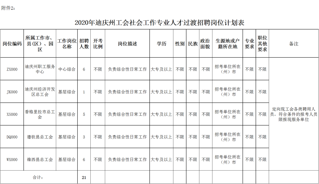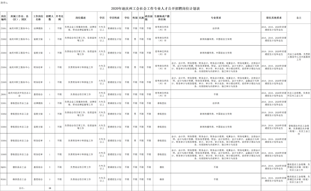 招聘计划招聘工会社会工作专业人才40名(其中:面向社会公开招聘19名,过渡考试招聘21名),具体岗位详见附件1、2。