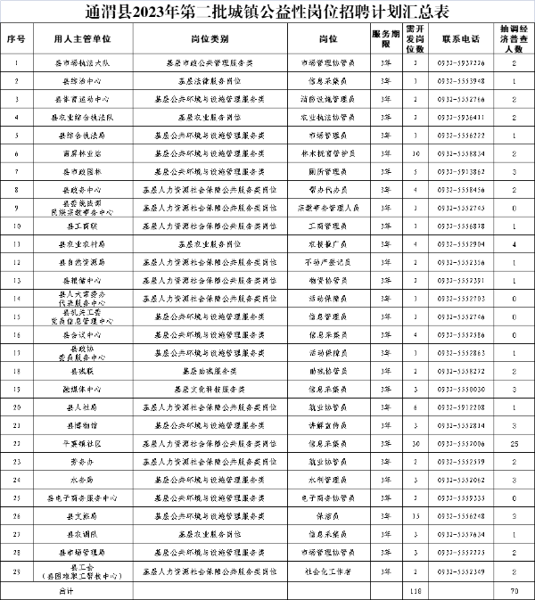 本次计划聘用城镇公益性岗位118个,在2023年9月至2024年3月期间,其中70名公益性岗位人员先参加全县经济普查工作,经济普查工作结束后,返回原用人单位(具体岗位详见附件1)。