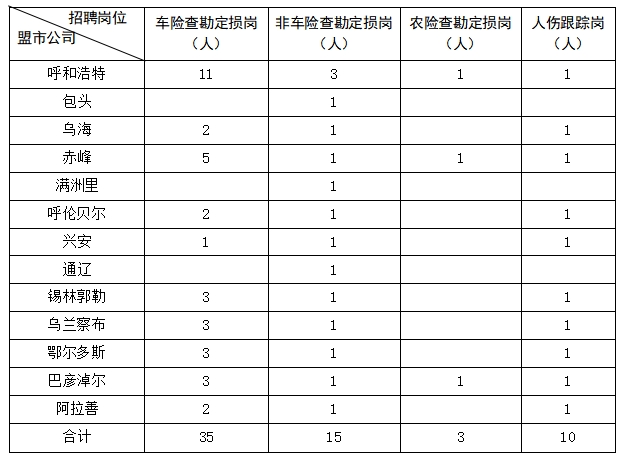 内蒙古金安达人力资源服务有限责任公司因工作需要,现向社会公开招聘63名理赔操作类岗位人员,派遣至中国人民财产保险股份有限公司内蒙古分公司下辖公司工作,现将有关事项作如下公告。
