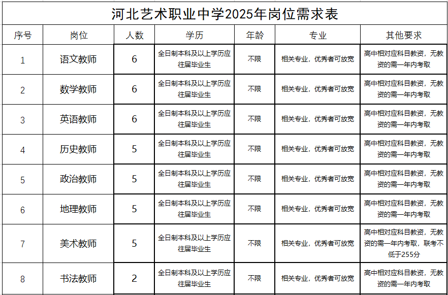 学校目前开设有文化高考升学班(文科实验班和理科实验班)及艺术高考升学班,设有美术、书法、音乐、舞蹈、民航运输与服务、体育六大专业,坚持“德育+艺术+文化”的育人特色,为艺术生定制课程,形成了专属教学体系;开创了“艺术+文化”互融式教学模式,形成了文专并举、和谐高效的管理特色。学校以“厚德、勤学、尚美、求真”为校训,拥有一支“仁爱而智慧、专注而专业、靠谱而灵动”的专业化教师队伍。因学校发展需要,现招聘高中各学科教师和骨干教师。