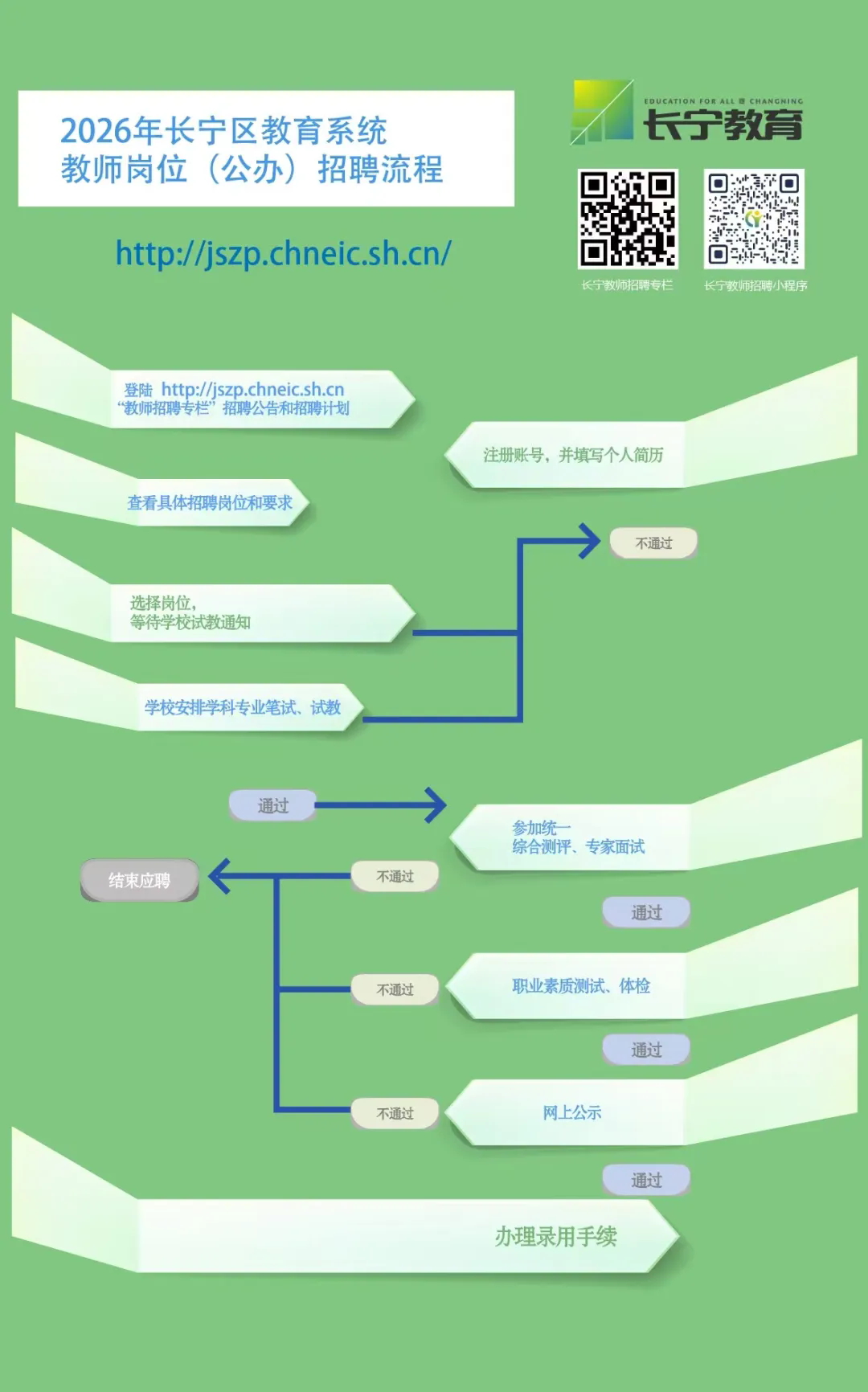 1.发布招聘信息。长宁区教师招聘信息通过“长宁教育人才服务中心”网站(https://jszp.chneic.sh.cn)发布。