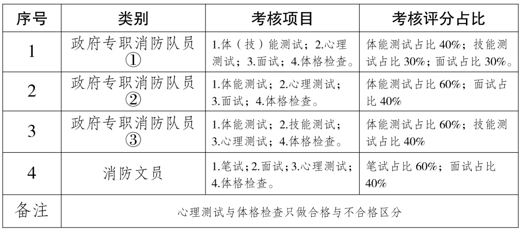 政府专职消防队员①面试考核,主要考察语言表达能力和综合素养等;政府专职消防队员②面试考核,主要考察语言表达能力、财务会计和计算机专业相关内容。面试采用百分制,低于60分视为淘汰,不参与下一项考核。