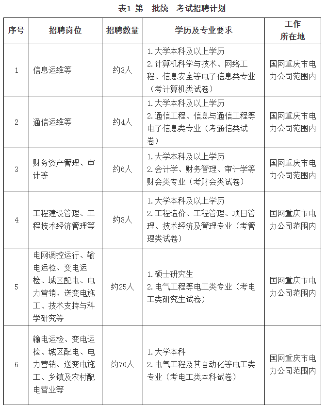 2026年第一批高校毕业生招聘计划人数约508人,最终招聘数量将根据上级单位核定情况相应调整。上述招聘数量含提前批校园招聘数量和第一批统一考试招聘数量,其中,第一批统一考试招聘人数约116人(如表1所示)。对计划中任一招聘岗位,若报名或参考人数比例未达到开考或招录比例的,公司有权缩减或取消该岗位招录计划,存在疑问的地方统一以公司解释为准。