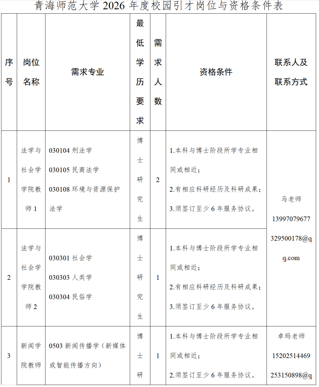 为深入实施“人才强校”战略,进一步加大高层次人才引进力度,根据学校学科建设、人才培养、科学研究、社会服务等工作发展需要,依据《青海省事业单位工作人员公开招聘办法》《青海省校园引才办法(试行)》《青海省2026年度引进高校优秀应届毕业生公告》等有关规定,决定面向2026届优秀高校毕业生引进急需紧缺人才46名。现将有关事项公告如下: