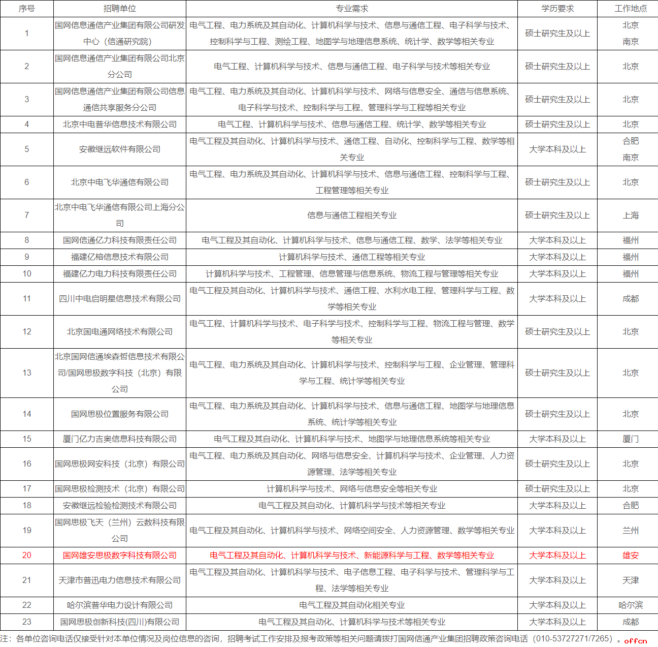 注:各单位咨询电话仅接受针对本单位情况及岗位信息的咨询,招聘考试工作安排及报考政策等相关问题请拨打国网信通产业集团招聘政策咨询电话(010-53727271/7265)。