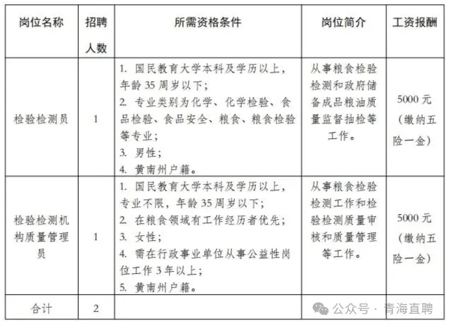 (二)用人单位:黄南州粮食安全质量检验检测中心