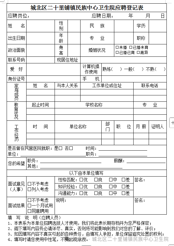 报名地址:二十里铺镇民族中心卫生院 六楼医院办公室(宁大路283-5号、报名时请提前将下方报名表填写好)
