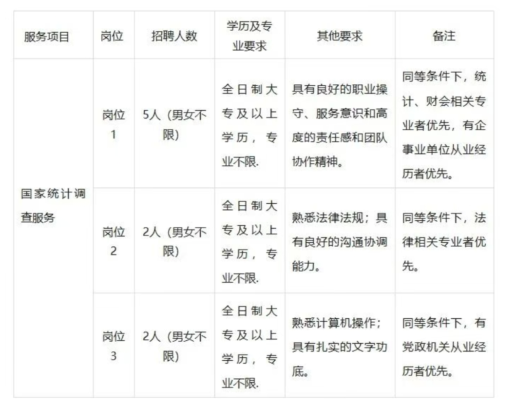 为确保国家统计调查服务政府购买服务工作的高效运行,根据工作需要,现统一面向社会公开招聘9名政府购买服务工作人员,现将具体事项公告如下: