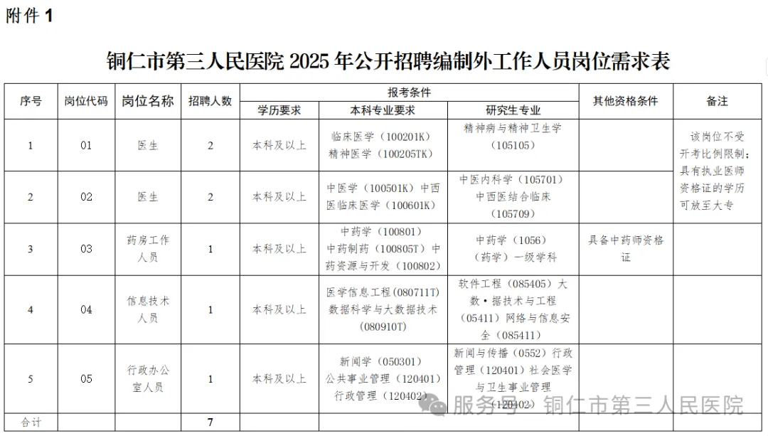 本次计划面向社会公开招聘编制外工作人员7名,具体招聘岗位及要求详见《铜仁市第三人民医院2025年公开招聘编制外工作人员岗位需求表》(附件1,以下简称《岗位需求表》)。