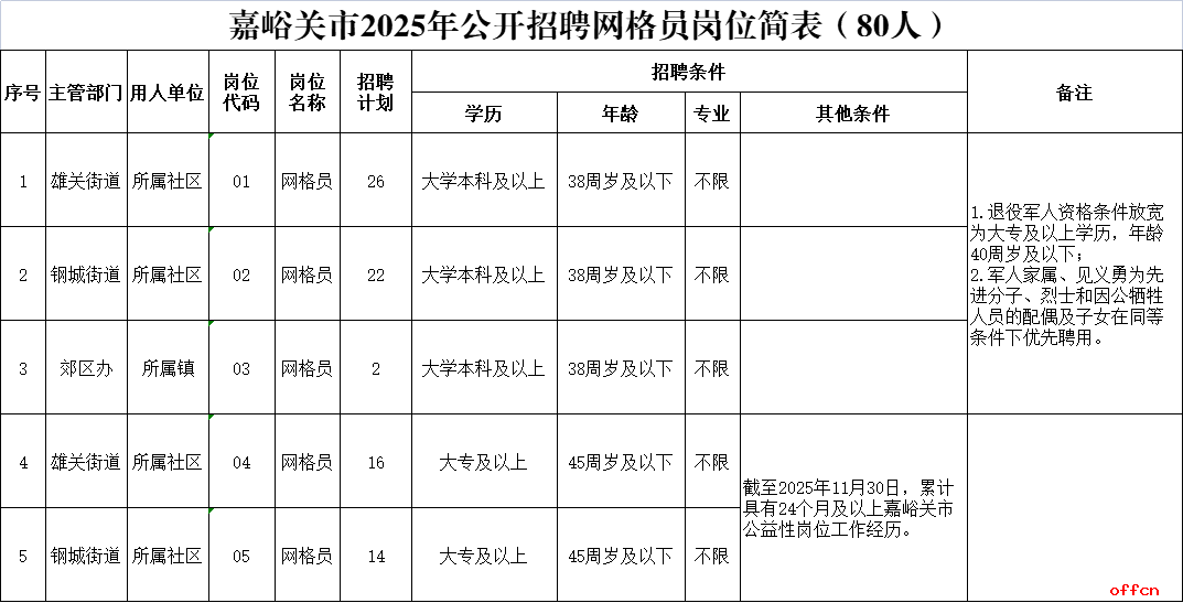 附件:嘉峪关市2025年公开招聘网格员岗位简表