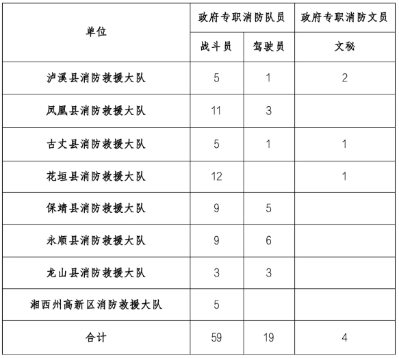 此次招聘由湘西消防救援支队组织,共招聘政府专职消防员队员78人(战斗员岗位59人,驾驶员岗位19人),政府专职消防文员4人,聘用人员培训考核合格后,由支队按照招聘计划统一分派到全州各所属队站承担驻勤任务和相关工作。具体招聘计划如下: