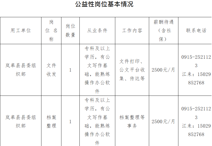 为贯彻落实就业援助政策,有效促进就业困难人员就业,根据工作需要及有关规定,现面向社会招聘2名公益性岗位工作人员(见附表)。应聘人员在规定时间内携带本人身份证、毕业证原件及复印件、《就业困难人员认定表》等资料到用人单位进行报名登记,用人单位初步确定拟聘用人选后,报县人社局进行审核、公示,公示无异议后,聘用人员与用人单位签订正式劳动合同。合同期限最长不超过三年。 报名时间:2025年11月24日—2025年11月28日 岚皋县人力资源和社会保障局 2025年11月24日