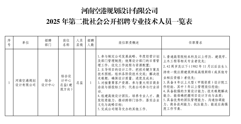 附件:河南空港规划设计有限公司2025年第二批公开招聘专业技术人员一览表