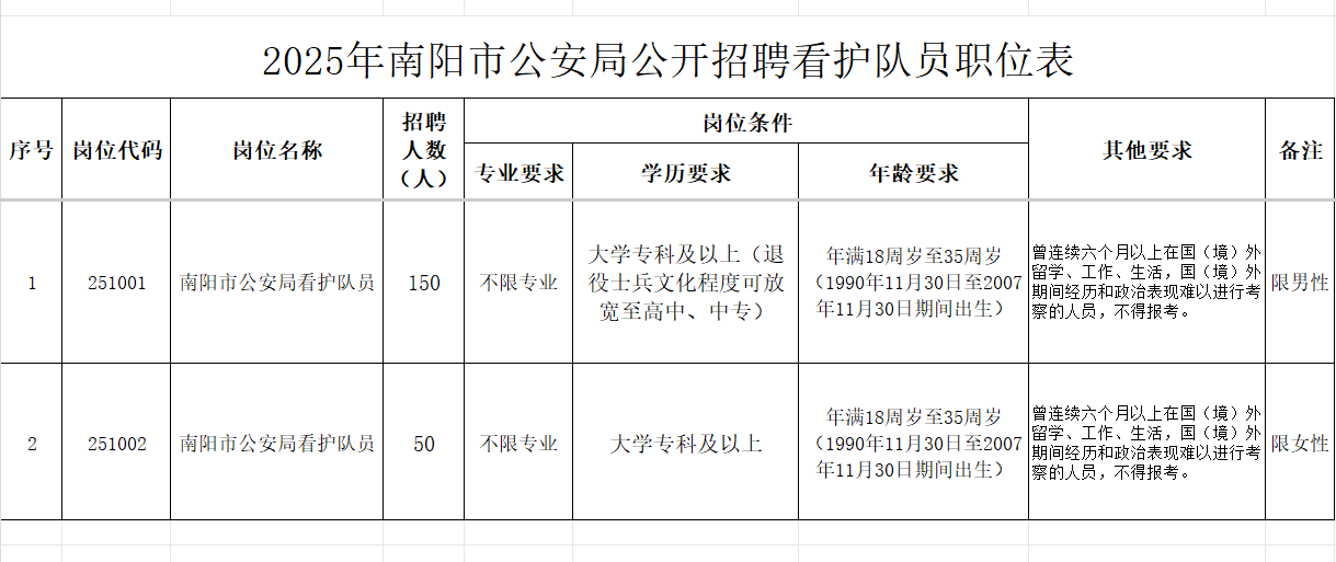 附件:2025年南阳市公安局公开招聘看护队员职位表.xlsx
