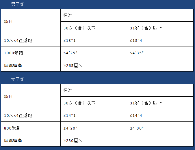 2.体能测试内容:体能测试项目为10米×4往返跑、1000(800)米跑、纵跳摸高。