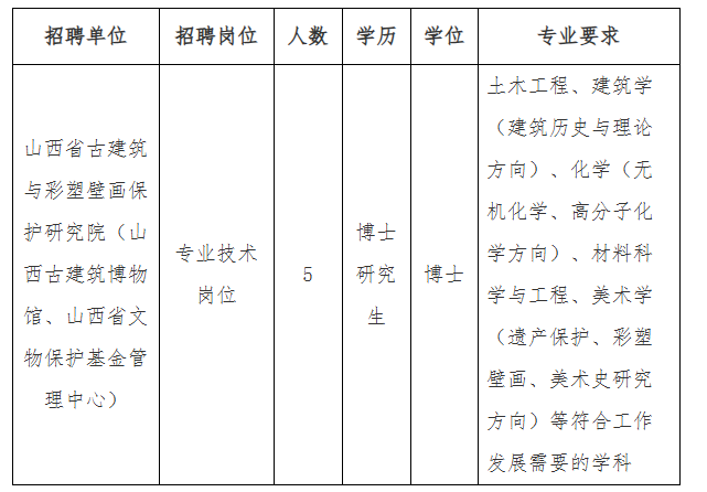 山西省古建筑与彩塑壁画保护研究院(山西古建筑博物馆、山西省文物保护基金管理中心)2025年公开招聘博士研究生5名,均为专业技术岗位。招聘岗位所需的具体条件见下表: