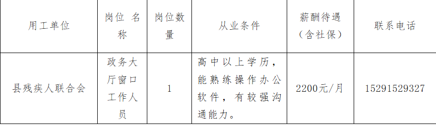为贯彻落实就业援助政策,有效促进就业困难人员就业,根据工作需要及有关规定,现面向社会招聘1名公益性岗位工作人员(见附表)。应聘人员在规定时间内携带本人身份证、毕业证原件及复印件、《就业困难人员认定表》等资料到用人单位进行报名登记,用人单位初步确定拟聘用人选后,报县人社局进行审核、公示,公示无异议后,聘用人员与用人单位签订正式劳动合同。合同期限最长不超过三年。