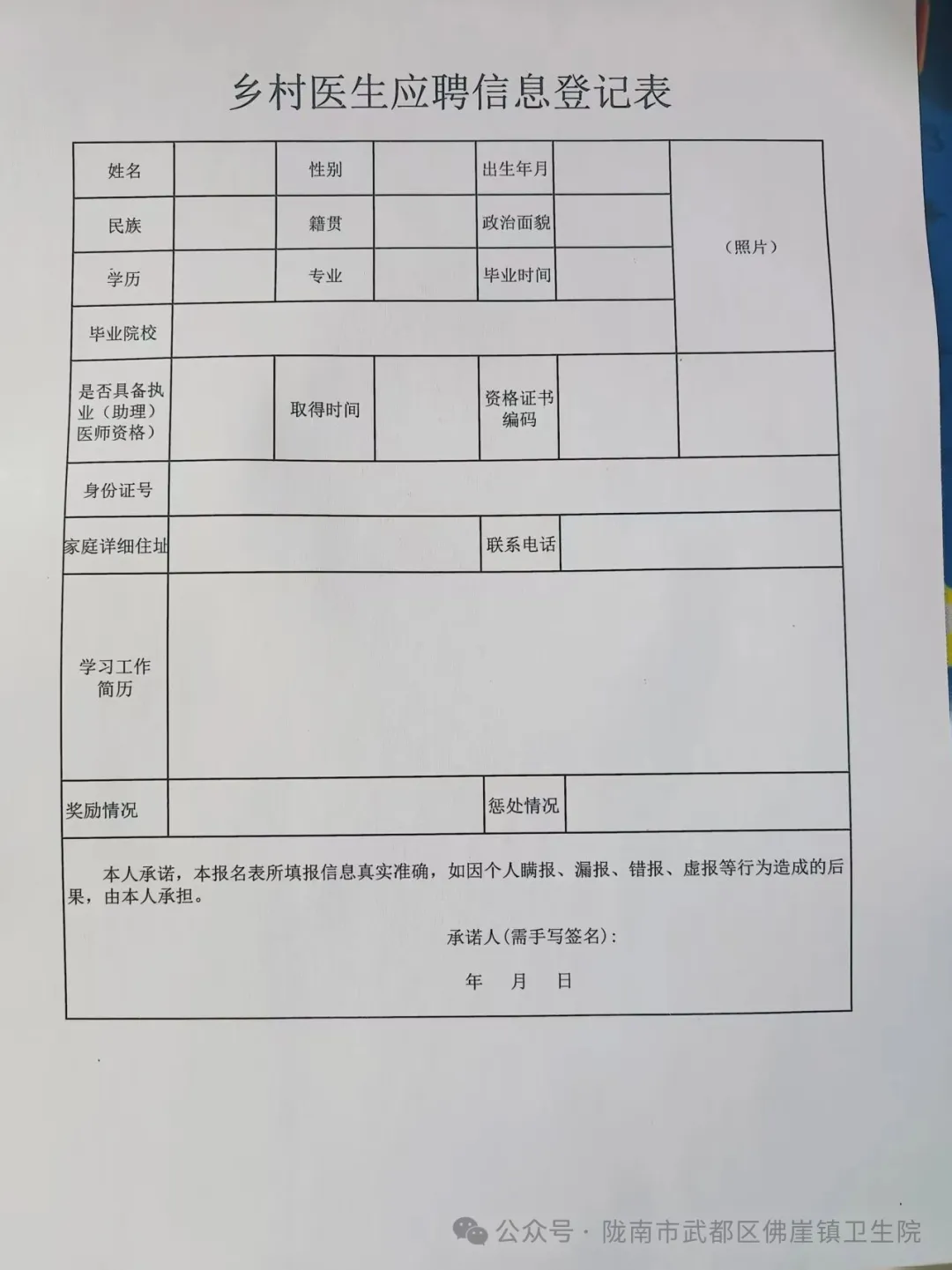 4.资格审查:应聘人员报名填写《武都区佛崖镇卫生院乡村医生应聘信息登记表》后,由武都区佛崖镇卫生院进行资格审查,资格审查不合格的取消报名资格,资格审查合格的由医院统一安排进行考试。注意:报名填写的联系方式是应聘人员联系的重要途径,应聘人员需保证手机畅通且中途不得更换联系方式,如因错填、中途更换联系方式、手机欠费、不在服务区、信息拦截、信息删除等个人原因导致无法参加考试的,所产生的一切后果由本人承担。
