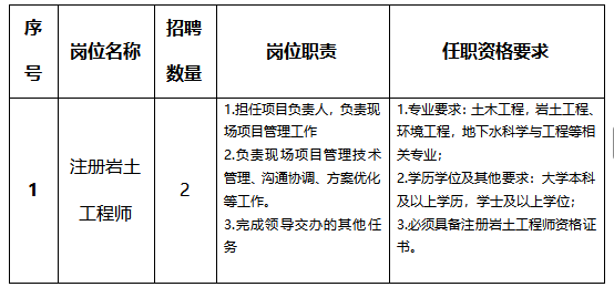 因工作需要,拟向社会公开招聘注册岩土工程师2名,有关公告如下: