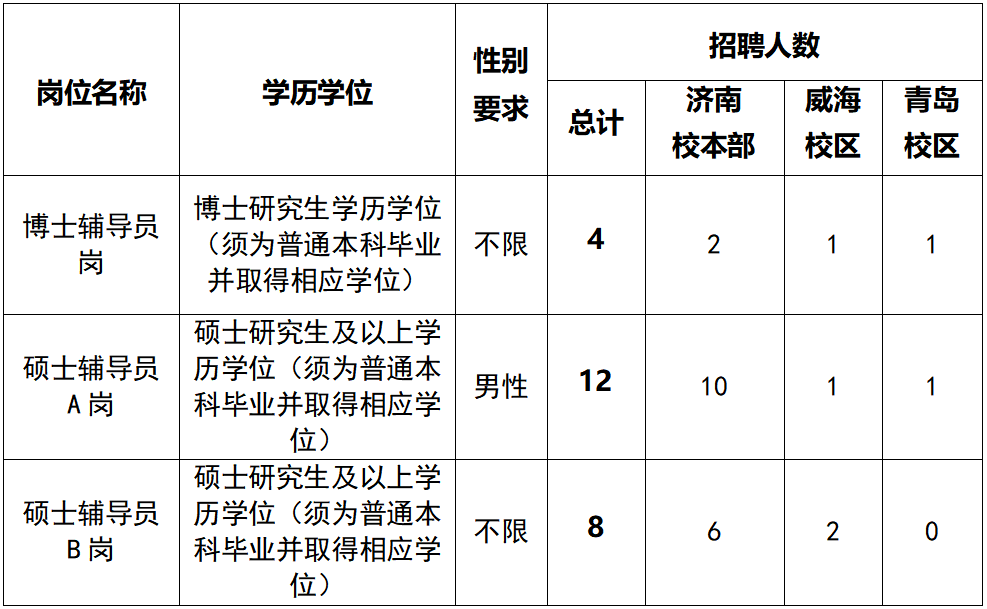 注:硕士辅导员A岗为驻男生公寓楼辅导员岗位,要求报考性别为男性,录用入职后须入住男生公寓楼开展相关工作,同时服从学校对岗位的安排和调整。