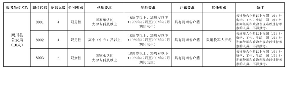 洛阳市公安机关计划招聘辅警共501名,其中,洛阳市公安局199名、洛阳市公安局偃师分局50名、洛阳市公安局孟津分局60名、新安县公安局50名、伊川县公安局68名、汝阳县公安局44名、嵩县公安局20名、栾川县公安局10名。招聘职位及有关要求详见附件1。