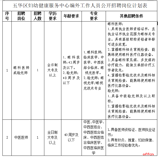 本次编制外人员招聘岗位:中医医师1名,眼科医生或验光师1名,本次招聘不设期限,以所需人员招满为截止时间。