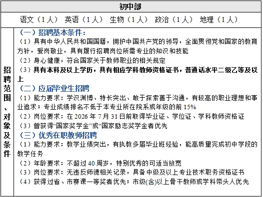 请将我校专用《教师应聘登记表》统一命名为“初中/高中/初高贯通+学科+姓名+应届/在职”,发送至指定招聘电子邮箱1358864302@qq.com。简历投递时间于2026年7月1日截止。