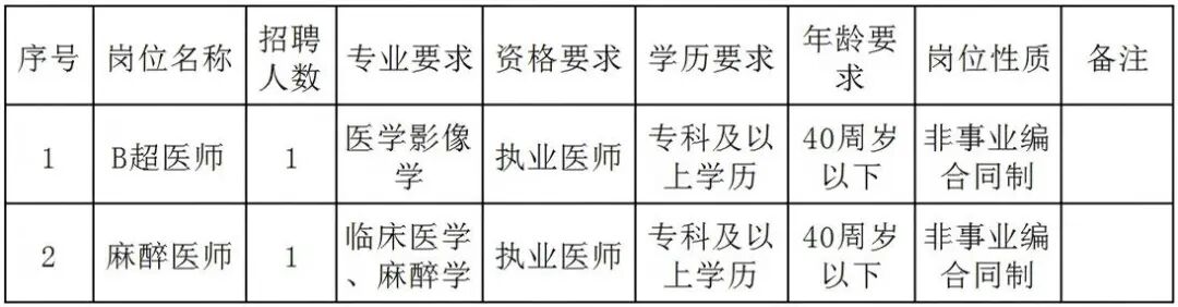因工作需要,我院拟向社会公开招聘B超医师1人、麻醉科医师1人,均属于非事业编合同制。