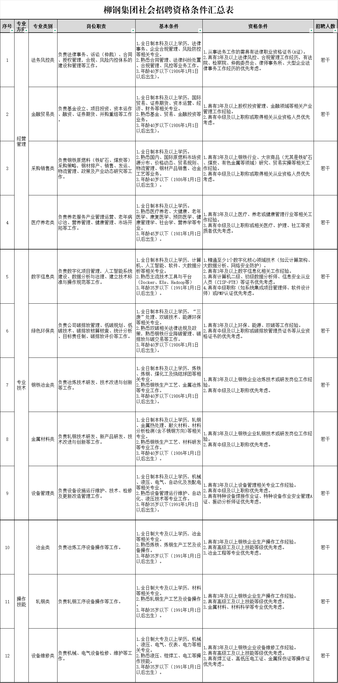 岗位包括:B层级(中层干部、技术专家)、C层级(科级干部、主任工程师)、D、E层级(技术主管、技术员、业务主管、一般管理人员、操作工人),具体岗位视应聘者资质条件、工作经历、工作业绩及柳钢集团的实际需求情况安排。