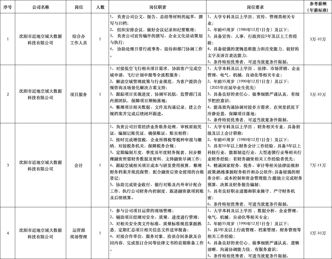 *相关岗位要求详见《沈阳市近地空域大数据科技有限公司岗位及要求一览表》及报名网址内详情。