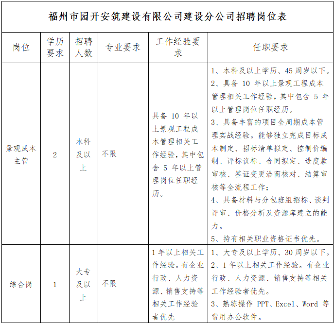 福州市园开安筑建设有限公司建设分公司是福州市园开安筑建设有限公司于 2025 年新成立的分支机构,专注于建筑工程施工管理相关业务因业务发展需要,公开招聘如下岗位(详见招聘岗位表附件1),现将有关事项公告如下: