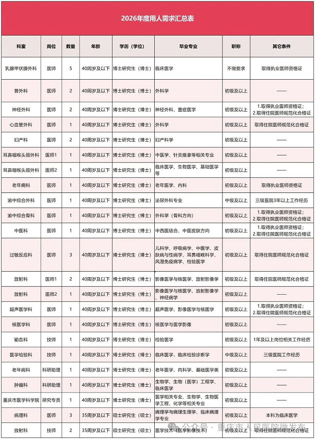 1.博士、紧缺硕士岗位经医院综合考核,提供编制,详见重庆市人力资源和社会保障局发布招聘公告。