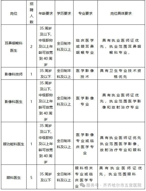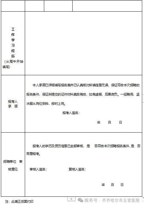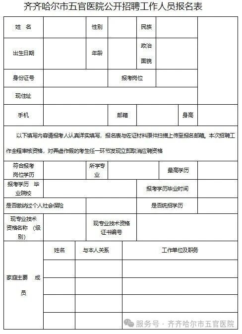 四、后附《齐齐哈尔市五官医院公开招聘工作人员报名表》