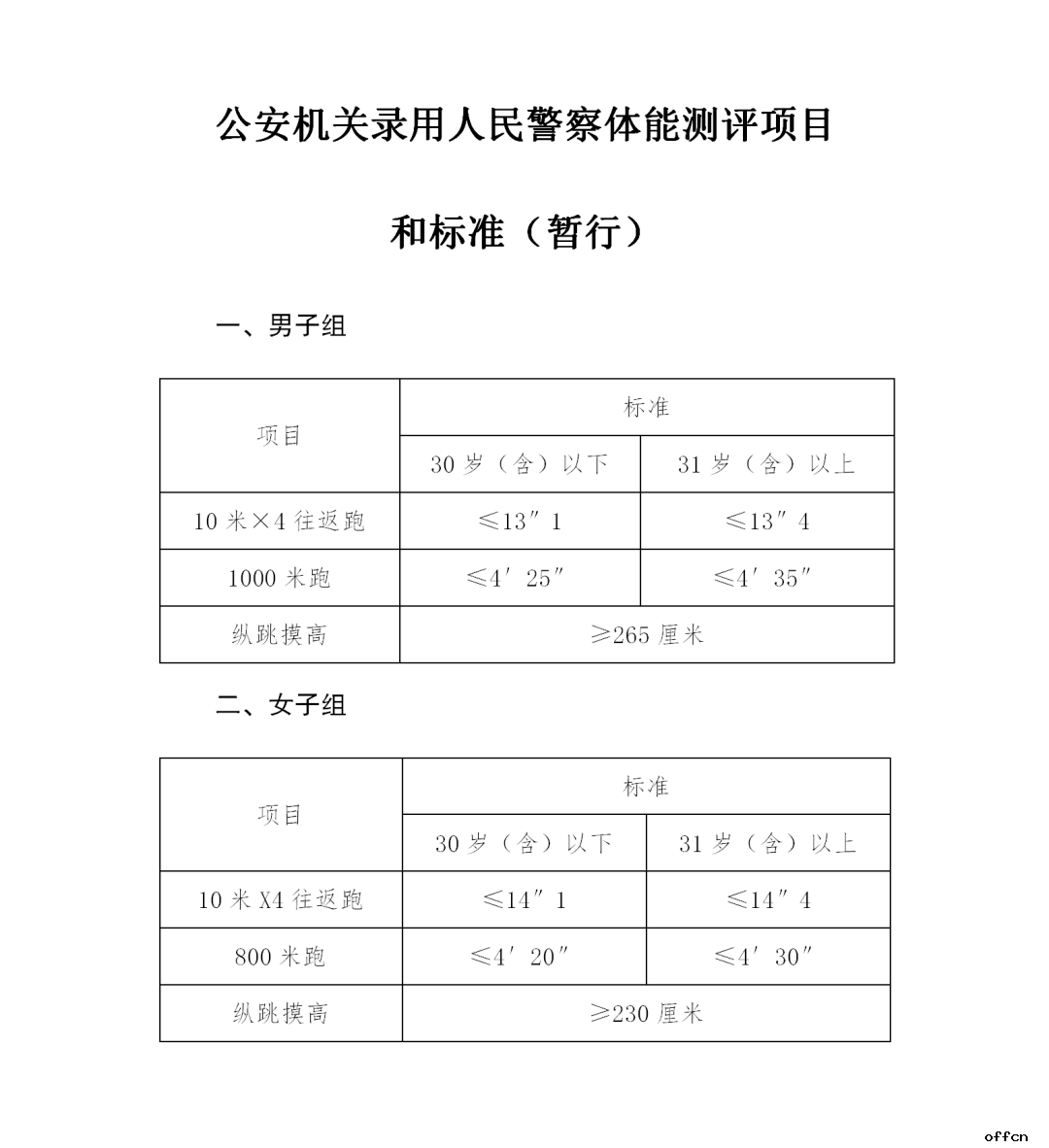 测评项目:男子:纵跳摸高、10米×4往返跑、1000米;女子:纵跳摸高、10米×4往返跑、800米。体能测评原则上参照《公安机关录用人民警察体能测评项目和标准(暂行)》(详情见附件)执行,合格者进入笔试、面试环节。