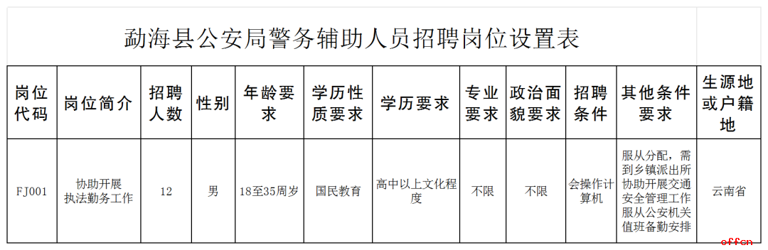 本次共招聘辅警12人,主要在勐海县公安局协助开展 执法勤务工作等工作。辅警不具有人民警察和公务员身份,不行使人民警察职权。具体岗位见《勐海县公安局警务辅助人员招聘岗位设置表》