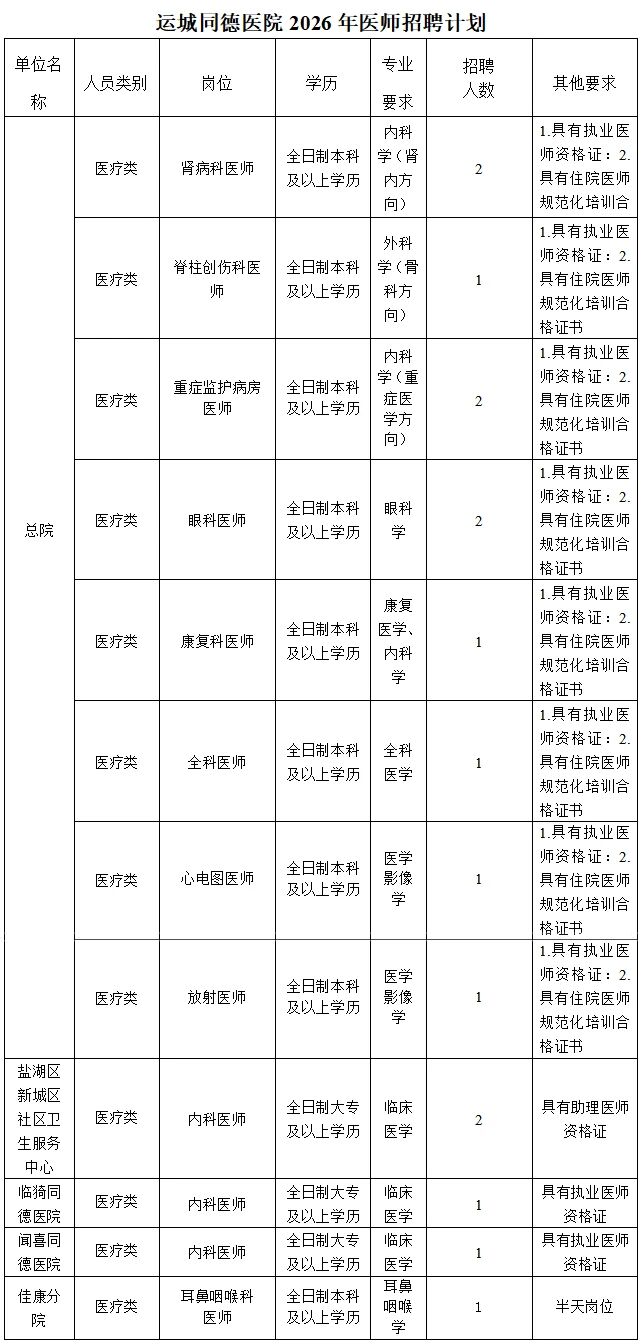 共招聘工作人员16名,其中总院11名医师;各分院共5名医师,运城市盐湖区新城区社区卫生服务中心(运城同德医院北院)2名,临猗同德医院1名,闻喜同德医院1名,佳康分院1名。