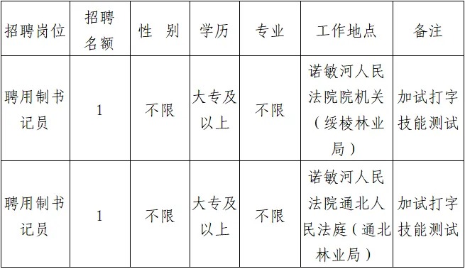 1.聘用制书记员岗位:诺敏河人民法院院机关1人、通北人民法庭1人;