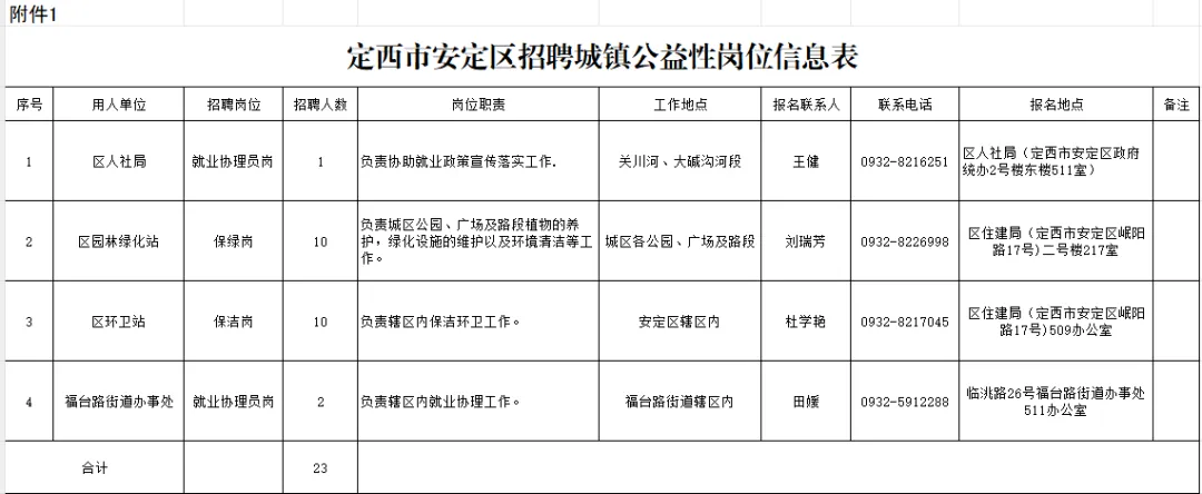 本次计划公开招聘城镇公益性岗位人员23名,用人单位、招聘岗位、招聘人数等信息详见定西市安定区招聘城镇公益性岗位信息表(附件1)。