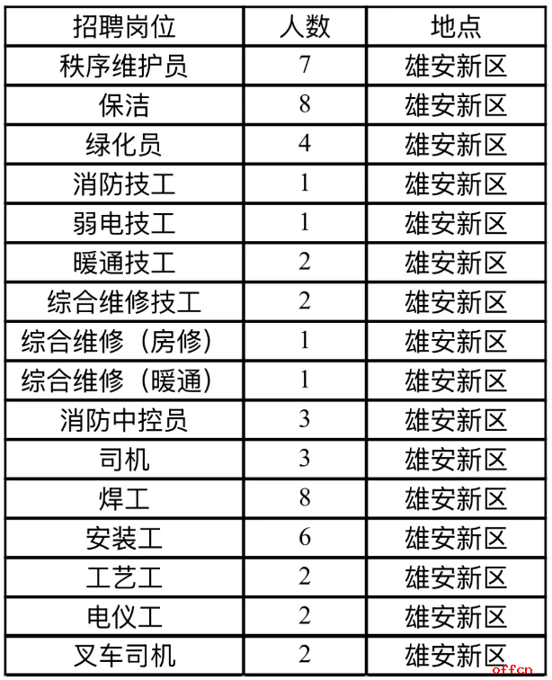 根据工作需要,现面向社会公开招聘秩序维护员、保洁、绿化员、消防技工、弱电技工、暖通技工、综合维修技工、综合维修(房修)、综合维修(暖通)、消防中控员、司机、焊工、安装工、工艺工、电仪工、叉车司机等外包岗位工作人员,诚邀您的加入!